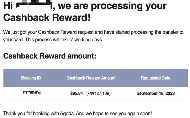 우선 아고다 숙소를 이용한 후 약 60일이 지나면, 아고다 회원 정보에 인증된 메일로 아래와 같은 캐쉬백 리워드 신청 메일이 날아옵니다. 메일에서 내가 예약한 ID, 캐쉬백 리워드 금액, 캐쉬백 리워드 신청 만료 기한을 확인할 수 있습니다.