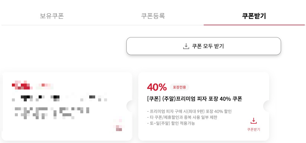 피자헛은 매주 주말 40% 포장 할인 프로모션을 진행하고 있습니다. 피자헛 홈페이지 또는 앱에서 마이페이지 > 쿠폰함 > 쿠폰받기로 들어가면 아래와 같이 주말 전용 할인 쿠폰을 받을 수 있습니다.