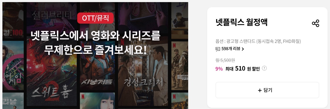 - 광고형 스탠다드 : 월 5500원(가족구성원 2명 동시 시청 가능, 중간 광고), 2명 이용 시 1인당 월 2750원