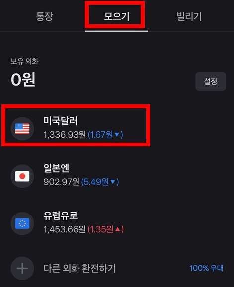 ① 토스 앱에서 토스뱅크 외화통장을 선택하면 모으기 > 보유 외화를 통해 현재 환율을 확인할 수 있습니다.
