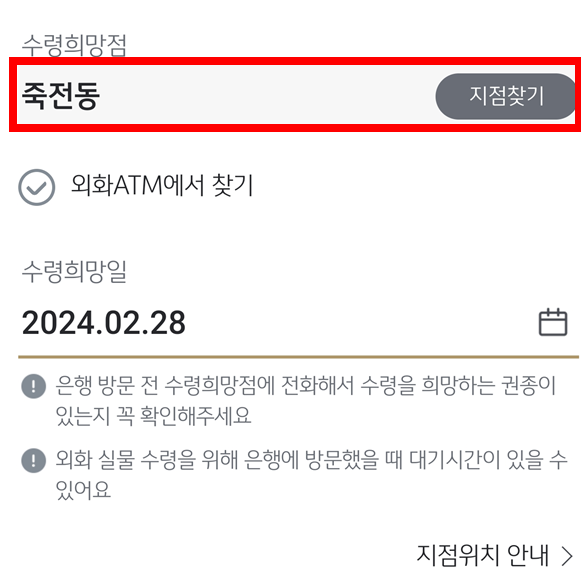 그리고 지점에서 받기를 선택하였을 경우에는 외화ATM에서 찾기를 누르면 ATM으로도 출금이 가능합니다.